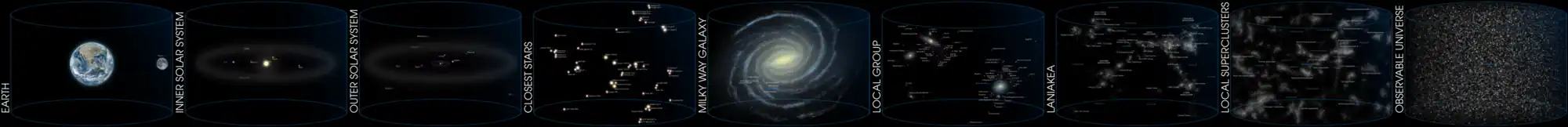 Mărimea întregului univers este necunoscută și ar putea fi infinită ca întindere.[18] Unele părți ale universului sunt prea departe pentru ca lumina emisă de la Big Bang să aibă suficient timp pentru a ajunge la Pământ și, prin urmare, se află în afara universului observabil. În viitor, lumina din galaxiile îndepărtate va avea mai mult timp să călătorească, astfel încât regiuni suplimentare vor deveni observabile.
