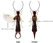 - Abdomen: Cerci nu au segmente și au formă de forceps. Ovipositorul femelei este redus sau absent.