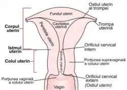 Uterul este un organ cavitar în formă de pară răsturnată. Pereții săi sunt formați din țesut muscular subțire. De la media de 6 - 8 centimetri înălțime și între 3 - 4 centimetri lățime, în cursul sarcinii dimensiunile lui se măresc considerabil (la sfârșitul sarcinii înălțimea uterului este de aproximativ 30 de centimetri).