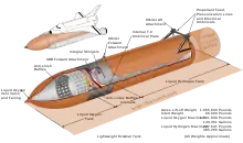 Arderea se face în amestec bogat, raportul de masă a celor două componente fiind de 1:4 – 1:6, astfel că în gazele de ardere se mai găsește hidrogen, ceea ce reduce eroziunea camerei de ardere și a ajutajului. Deși arderea este incompletă, masa hidrogenului nears și scăderea masei molare a gazelor evacuate compensează întrucâtva scăderea impulsului specific datorită arderii incomplete. Rezervorul de combustibil al rachetei navetei spațiale conține 515,5 m³ hidrogen și 554 m³ oxigen. Temperatura în camera de ardere atinge 3300 °C, viteza de evacuare fiind de 4440 m/s în vid, respectiv 3560 m/s la presiune normală. Fiecare din cele trei motoare principale dezvoltă o tracțiune de 1,8 MN.