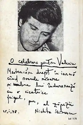 - „O celebrare pentru Valeriu”, de Nichita Stănescu, este o poezie care a apărut, întâia oară, în caietul-program Zilele poeziei românești „Nichita Stănescu”, ediția a III-a, 30 - 31 martie 1988, Ploiești; colecția Valeriu Pantazi. Text olograf, în facsimil, cu modificări: și, umbra lui „înnegrește” îndurerează (versul 3) ca o „dungă” cicatrice.