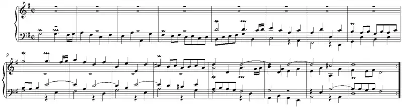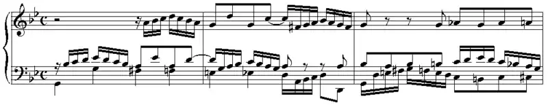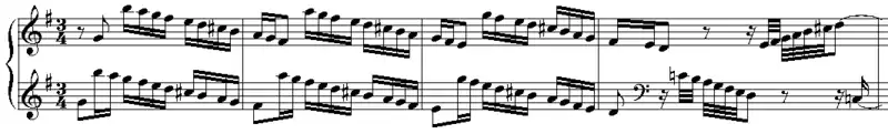| Variatio 13. a 2 Clav. Această variațiune este o sarabandă lentă, liniștită și abundent decorată. Melodia este scrisă în cea mai mare parte folosind note treizecidoime și e ornamentată cu apogiaturi și mordenți. ![]() |