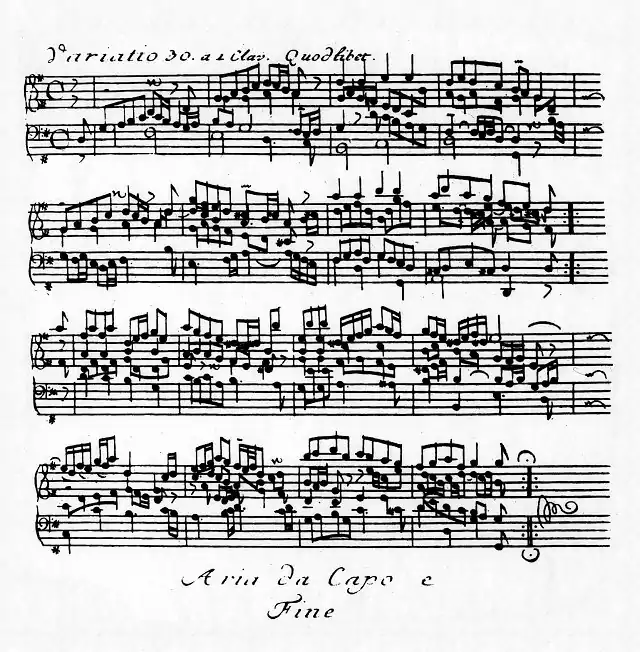 | Variatio 30. a 1 Clav. Quodlibet Acest quodlibet este bazat pe mai multe cântece populare germane, două dintre ele fiind Ich bin solang nicht bei dir g'west, ruck her, ruck her și Kraut und Rüben haben mich vertrieben, hätt mein' Mutter Fleisch gekocht, wär ich länger blieben, celelalte rămânând neidentificate. ![]() |