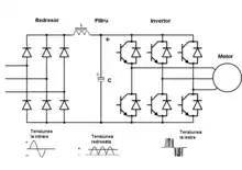 Variatoarele de frecvență sunt compuse din 3 părți principale, un redresor, un filtru capacitiv (sau capacitiv-inductiv) și un invertor. Comanda tranzistoarelor invertorului este dată de un microprocesor și are la bază metoda modulării în lățime a impulsurilor (în engleză PWM - Pulse Width Modulation).[1] Tranzistoarele sunt de obicei de tip IGBT (în engleză Insulated Gate Bipolar Transistor), și ele comută la frecvențe de ordinul 2-20 kilohertzi. Mărirea acestei frecvențe produce un curent mai „sinusoidal” ceea ce rezulta in mai puțin zgomot prin motor, însă proporțional cresc și pierderile de comutație; Alte dezavantaje sunt: creșterea interferentei electromagnetice si reducerea lungimii maxime permise a cablului electric dintre variator și motor.