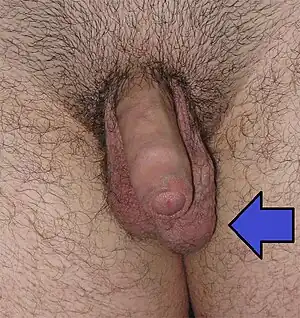 ![]() Varicocel la testiculul stâng (este evidențiat de săgeata albastră. | |