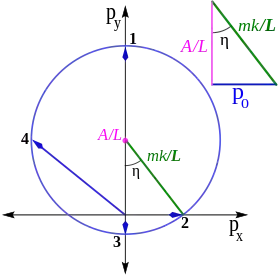 Prin urmare, vectorul impuls, p este limitat la un cerc de rază mk/L = L/ℓ cu centrul în punctul de coordonate (0, A/L). Excentricitatea e corespunde cosinusului unghiului η reprezentat în figura 3. Acest cerc este hodograful circular al impulsului pentru o problemă Kepler.