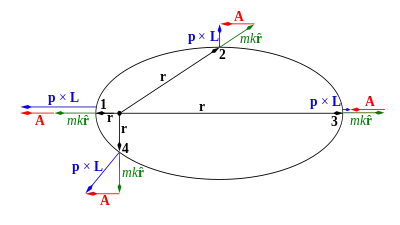 Mai mult, din presupunerea că forța este o forță centrală, rezultă că vectorul de moment cinetic L este o mărime conservativă și definește planul în care particula se mișcă. Vectorul LRL, A , este perpendicular pe vectorul momentul cinetic L deoarece atât p × L cât și r sunt perpendiculare pe L. Rezultă că A se află în planul orbitei.