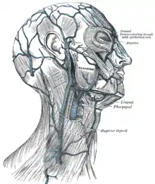 ![]() Venele capului și ale gâtului (vena frontală este localizată în dreapta sus) | |