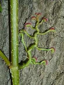 Frunzele sunt palmat compuse, formate din cinci frunzulițe (rareori trei, în special pe lăstarii tineri, și, uneori, șapte) unite într-un punct central pe vrej, și variază de la 3 la 20 de centimetri (rareori 30 de centimetri) diametru. Frunzulițele au muchia crestată. Specia este adesea confundată cu P. vitacea(d), care are frunze similare, dar nu are vârfuri lipicioase pe cârcei.