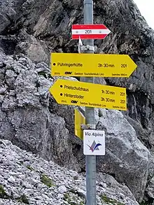 Pentru Via Alpina, nu au fost construite niciun traseu și nicio nouă infrastructură. S-a recurs la rețeaua traseelor și refugiilor turistice deja existente. Logoul Via Alpina a fost adăugat la vechea semnalizare. 340 de locuri de popas sunt echipate cu panouri de informații multilingve.