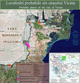 Vicina – colonie genoveză[35] sub stăpânire bizantină, a fost una dintre cele mai vechi așezări de tip urban cunoscute pe teritoriul românesc extracarpatic, la începuturile Evului Mediu.[36] Numele său derivă dintr-un cuvânt de origină romanică ce semnifică „vecinătate”, ceea ce sugerează că orașul s-a dezvoltat în proximitatea imediată a altuia mai vechi.[32]
