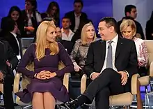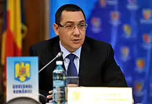 Victor-Viorel Ponta (n. , București, România) este un om politic român. Este în prezent co-fondator și președinte al Partidului PRO Romania, alături de Daniel Constantin.[8] A deținut funcția de cel de-al 63-lea prim-ministru al României din 7 mai 2012 până la demisia sa în 4 noiembrie 2015.[9] Victor Ponta a fost președinte al Partidul Social Democrat din 2010 până în 2015 și deputat de Gorj. A fost copreședinte alături de liberalul Crin Antonescu al Uniunii Social-Liberale, Uniune înființată la inițiativa lui Dan Voiculescu.[10]
