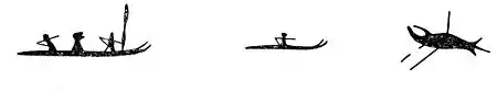 | În stânga — o amuletă aleutină care reprezintă o femelă de vidră de mare cu puiul ei. Sus — o scenă de vânătoare de vidre de mare la aleuți, imortalizată pe o suliță. Aleuții atribuiau acestor imagini calități magice.[53] |