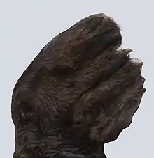 Laba anterioară (în stânga) și cea posterioară (în dreapta). Degetele se dezvoltă împreună pe ambele membre, în plus, în cazul membrelor posterioare, ele sunt unite până la ultima falangă, ceea ce duce la transformarea labelor posterioare în înotătoare. Lungimile degetelor de pe laba posterioară se schimbă într-o altă ordine decât la majoritatea mamiferelor, micșorându-se treptat de la al cincilea spre primul. |