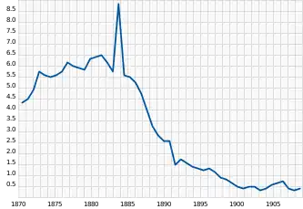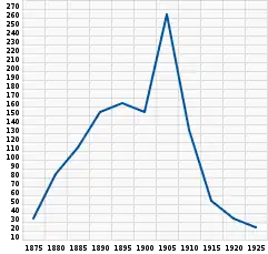 | Evoluția vânării vidrelor de mare pe insulele Comandorului în perioada anilor 1870-1924 (conform materialelor arhivei vânătorești a insulelor Comandorului[8]) | Evoluția cantității de blănuri de vidră de mare licitate la Londra în perioada anilor 1871-1910 (mii de bucăți; conform registrelor de la burse[47]) |
