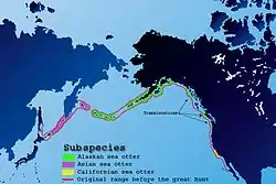 - vidra de mare nordică Enhydra lutris kenyoni (Wilson, 1991[24]), pe insulele Aleutine și în sudul peninsulei Alaska.