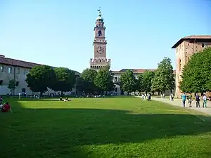 Originile turnului Bramante, situat în punctul cel mai înalt al orașului (🌍), lângă castel, se regăsesc în anul 1198 și a fost terminat, de Bramante, la sfârșitul secolului al XV-lea. Turnul a fost inspirat după cel al lui Filarete situat în curtea castelului Sforzesco din Milano. Încă de la prima terasă a turnului se poate observa Piazza Ducale, curtea castelului și chiar orașul Vigevano.