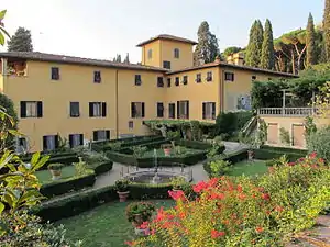 Accesul la vilă se face pe un drum conectat la via Fontanelle (înainte accesul era prin via Mantellini), drum flancat de o clădire din anii douăzeci folosită ca serviciu de concierge, de un zid de delimitare și de un șir de chiparoși, și care se termină într-o piațetă la nord de vilă. Dincolo de chiparoși se extinde până la vilă un teren destinat cultivării de măslini și arbori fructiferi. La sfârșitul bulevardului se vede o clădire de serviciu și o mică capelă, acum desacralizată. Grădina propriu zisă este dispusă pe terase la înălțimi diferite; prin două scări curbate (dispuse în formă “de clește”), urmate de o cale rectilinie între chiparoși, se ajunge la o "exedră”, parcurgând o pădure bogată în specie de arbori, cum ar fi pini, tei, platani, nuci americani, tise, arțari, stejari, plopi și cedri.