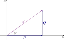 Unde este puterea activă, este puterea reactivă, iar este simbolul unității imaginare (în electrotehnică este preferat simbolului , cu care se notează intensitatea curentului).