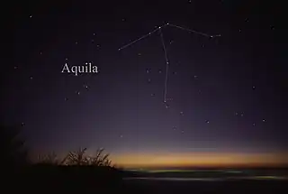 Constelația Vulturul văzută cu ochiul liber. Pentru identificarea mai ușoară au fost trasate linii între stele.