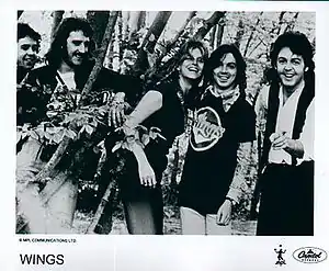 ![]() Wings, 1975. S-d: Joe English, Denny Laine, Linda McCartney, Jimmy McCulloch, and Paul McCartney. | |