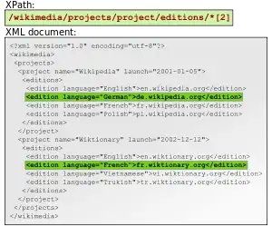 selectează adresele tuturor proiectelor în engleză ale Wikimedia (textul pentru toate elementele edition în care atributul language este egal cu English), iar următorul
