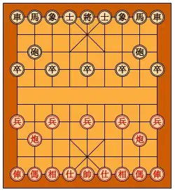 Xiangqi se joacă pe o tablă de 9x10. Piesele sunt așezate pe intersecția liniilor nu în careuri. Fiecare jucător începe jocul cu următoarele piese 1 rege (sau general), 2 gărzi (sau sfătuitori), 2 elefanți (sau nebuni), 2 cai, 2 ture (sau care de luptă), 2 tunuri, 2 canoni și 5 pioni (sau soldați).