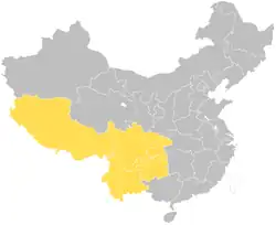| Tibet | 西藏 | Xīzàng | བོད་རང་སྐྱོང་ལྗོངས | 藏 zàng | Lhasa | 拉萨 | Lāsà | ལྷ་ས་ |