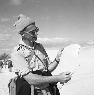 ![]() Yohanan Aharoni examinând un fragment de lut la Tell Abu Salima în nordul Sinaiului, fotografie din 1957 de Benno Rothenberg | |