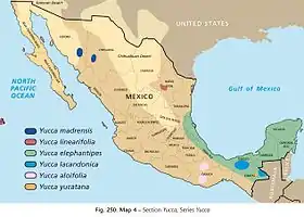 Yucca aloifolia, plantă originară din regiunile sudice ale Statelor Unite, Mexic și vestul Indiei prezintă frunze dese, cu marginile fin dințate dispuse în rozetă la extremitatea tulpinilor. Trunchiul crește până la 0,9-1,2 m înălțime și uneori formează la bază rozete noi. Dacă a fost plantată în grădini sau parcuri, această plantă înflorește în luna august (în România)[4].