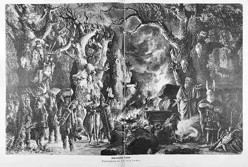 Era obiceiul străvechi că atunci când trebuia să se facă sacrificiu, toți fermierii trebuiau să vină la templul păgân și să aducă împreună cu ei mâncarea de care aveau nevoie în timp ce dura sărbătoarea. La această sărbătoare, toți aveau să ia parte la băutura de bere. De asemenea, tot felul de animale au fost ucise în legătură cu aceasta, cai, de asemenea; și tot sângele din ele a fost numit hlaut [sânge de sacrificiu] și hlautbolli , vasul care deține sângele; și hlautteinar , Crengi de sacrificiu [ Acestea erau modelate ca sprinklere și cu ele trebuia să fie împrăștiate peste tot cu sânge piedestalele idolilor și zidurile templului din interior și din exterior; și la fel bărbații prezenți trebuiau stropiți cu sânge. Dar carnea animalelor urma să fie fiartă și servită ca hrană la banchet. Focurile urmau să fie aprinse în mijlocul etajului templului, iar fierbătoarele atârnau peste focuri. Paharul de sacrificiu trebuia să fie purtat în jurul focului, iar cel care făcea sărbătoarea și era șef, trebuia să binecuvânteze paharul, precum și toată carnea de sacrificiu. [15]