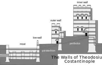 Zidurile teodosiene sunt formate dintr-o triplă linie de fortificații:[8] zidul interior principal (μέγα τεῖχος, mega teichos, „marele zid”), separat de zidul exterior inferior (ἔξω τεῖχος, exō teichos sau μικρὸν τεῖχος, mikron teichos, „zid mic”) printr-o terasă, numită peribolos (περίβολος).[40] În spațiul dintre peretele exterior și șanț (σοῦδα , souda) se găsea o terasă exterioară, parateichion (τὸ ἔξω παρατείχιον), în timp ce o fortificație mică se afla pe pantă abruptă estică a șanțului (un fel de parapet).[8] Accesul la ambele terase era posibil prin posterne, mici porți secundare aflate pe laturile turnurilor zidurilor.[41]