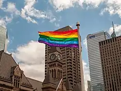 ![]() Steagul LGBT fluturând în fața primăriei din Toronto cu ocazia Zilei internaționale împotriva homofobiei, bifobiei și transfobiei | |