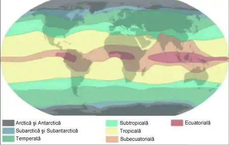 | Temperată (nordică și sudică) | Climatul temperat continental sau oceanic | Păduri de foioase, stepe, semideșerturi |