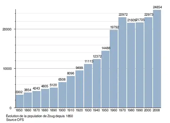 Conform datelor publicate de Oficiul Federal de Statisticǎ, Zug posedǎ 24.854 locuitori în 2008[2].