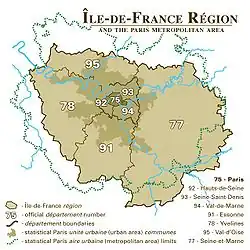 | Departamente | Essonne Hauts-de-Seine Paris Seine-Saint-Denis Seine-et-Marne Val-de-Marne Val-d'Oise Yvelines |
