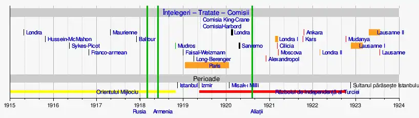 Împărțirea teritoriului otoman fusese plănuită încă din primele zile ale războiului[2], deși în rândul aliaților au existat neînțelegeri cu privire la acest subiect, care au dus la negocieri repetate[3]. După ocuparea Istanbulului de către trupele franco-britanice în noiembrie 1918, guvernul otoman s-a prăbușit efectiv, semnând aproape fără împotrivire Tratatul de la Sèvres din 1920. Declanșarea de către naționaliștii turci a Războiului de Independentă i-a forțat în cele din urmă pe Aliați să renegocieze condițiile de pace. Aliații și Marea Adunare Națională a Turciei au semnat și ratificat un nou tratat de pace, cel de la Lausanne din 1923, cu prevederi mult mai favorabile turcilor. Problemele nerezolvate au fost mai apoi negociate în cadrul Ligii Națiunilor, așa cum a fost cazul provinciei Mosul (1925).