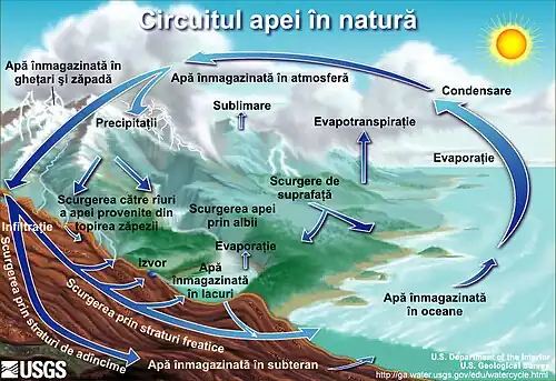 Cantitatea de vapori de apă din atmosferă depinde exclusiv de termodinamica atmosferei.[32] Cantitatea de vapori de apă pe care o poate conține aerul este în funcție de presiunea de saturație, care, la rândul ei, depinde de temperatură. Presiunea de saturație a vaporilor de apă în atmosferă se poate exprima prin formule teoretice simple,[33] sau, mai exact, prin formule semiempirice (formule ale căror constante au fost determinate pe baza observațiilor experimentale), cum sunt relațiile Wexler.[34] Presiunea de saturație a vaporilor de apă crește repede cu temperatura, astfel că dacă la 10 °C 1 kg de aer uscat poate absorbi 7,73 g de apă, la temperatura de 30 °C poate absorbi 27,52 g.[35]