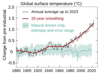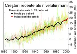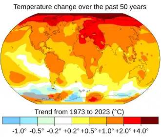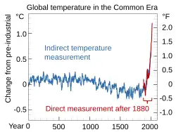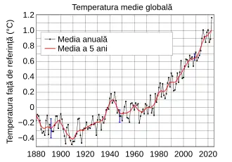 Temperatura medie a aerului în apropierea suprafeței Pământului a crescut în Ultimulul secol cu 0,74 ± 0,18 °C.[3]