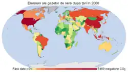 După cum se vede din figurile alăturate, pe țări, cele mai mari emisii de CO2 le au Statele Unite ale Americii, urmate de China, Indonezia, Rusia, India și Brazilia. Emisiile de CO2 ale SUA se datorază economiei sale, mare consumatoare de petrol, iar ale Chinei și Rusiei datorită industriilor lor energetice bazate pe arderea cărbunilor.