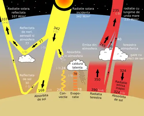 În figura alăturată sunt prezentate fluxurile termice în atmosferă, în regim stabilizat. Din radiația solară incidentă, de 342 W/m2 cota de 107 W/m2 este reflectată de atmosferă și sol. Restul este reținut în atmosferă sau ajunge pe sol. Din totalul de 559 W/m2 (67 + 24 + 78 + 390) din atmosferă, 235 W/m2 sunt radiați în afara atmosferei, iar restul de 324 W/m2 se reîntorc pe Pământ datorită efectului de seră. În acest fel se închide bilanțul energetic (342 = 107 + 235).