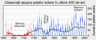 Nu se cunoaște prea bine influența ciclului solar asupra climei, însă lipsa petelor solare din a doua jumătate a secolului al XVII-lea a coincis cu o perioadă foarte friguroasă, perioada minimului Maunder, numită „mica glaciațiune”, sau „mica eră glaciară.[7]