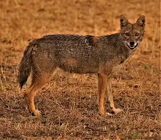 Șacalul auriu[5] (Canis aureus) este un mamifer carnivor sălbatic, din familia canidelor, asemănător cu vulpea și lupul, de culoare galben-aurie, spre roșcat, cu coada scurtă, ciuntită la vârf, urechi relativ mari, ascuțite, îndreptate în sus și bot ascuțit. Lungimea corpului este de 0,70-1,05 m, iar greutatea poate atinge 15 kg. Trăiește în nordul Africii, sudul Asiei și în sudul Europei, inclusiv în România (subspecia Canis aureus moreoticus în sudul Olteniei, Munteniei și Dobrogei). Este un animal gregar, trăind în haite, fiind activ noaptea. În timpul împerecherii sau al căutării congenerilor din haită, scoate un urlet pătrunzător, caracteristic. Se încrucișează cu câinele și se poate îmblânzi relativ ușor. Se hrănește cu animale mici (păsări, șoareci sau alte rozătoare) și hoituri, consumă și multe vegetale. Bârlogul șacalului este ascuns în locuri singuratice, văgăuni cu mărăcinișuri, scobituri de pământ. Se împerechează în februarie-martie. După o gestație de 9 săptămâni, femela fată 4-8 pui, rareori mai mulți, care sunt lipsiți de vedere două săptămâni. Puii sunt alăptați 3 luni. Are o blană excelentă folosită în confecționarea articolelor de îmbrăcăminte.