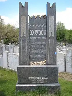 - ↑ en „Vast Crowds Honor Sholem Aleichem; Funeral Cortege Of Yiddish Author Greeted By Throngs In Three Boroughs. Many Deliver Eulogies Services At Educational Alliance Include Reading Of Writer's Will And His Epitaph”. New York Times. 16 mai 1916, Tuesday. Accesat în 20 aprilie 2008.