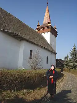 Biserica reformată din Sâncraiu, cu o săteancă în costum popular