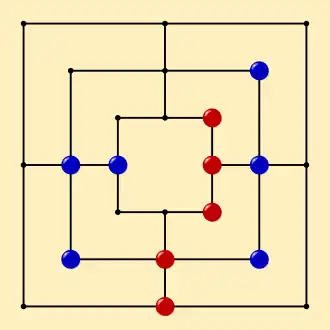 - În prima etapă jucătorii pun pe rând câte una din piesele proprii pe punctele tablei de joc. Această etapă se încheie când sunt plasate pe tablă toate cele 18 piese.