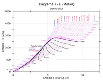 Valorile se găsesc gata calculate în tabele [6], însă în practică este mult mai intuitivă folosirea unor diagrame termodinamice.[6][7] Se folosesc diagrama T-s și diagrama i-s, care sunt larg folosite în aprecierea randamentului termic al ciclului Clausius-Rankine și a randamentului intern al turbinelor cu abur.