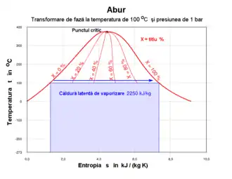 Titlul aburului ia valori între 0 (apă la saturație) și 1 (abur saturat). Pentru diferite presiuni, în diagrama T-s (v. fig. alăturată) starea de apă la saturație este pe curba de x = 0, iar starea de abur supraîncălzit este pe curba de x = 1. La presiunea normală (de 101325 Pa = 1,013 bar) căldura latentă de vaporizare (căldura necesară fierberii) este de 2257 kJ/kg. La presiuni mai mari, această căldură scade, curbele x = 0 și x = 1 se apropie și se întâlnesc la presiunea critică de 221,2 bar în punctul critic, a cărui temperatură este de 374 °C. Peste această presiune, este domeniul supracritic, în care vaporizarea apei se face fără o transformare de fază vizibilă, prin umflare continuă.[9]