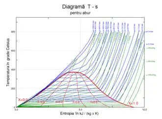 Domeniul din diagrama T-s de sub curbele x = 0 și x = 1 este domeniul aburului umed.