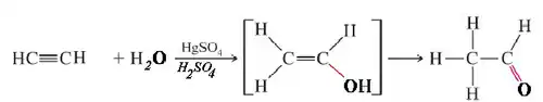 Alternativ, din hidratarea acetilenei, catalizată cu săruri de mercur, rezultă etanol, care duce la acetaldehidă. Această metodă a fost folosită înaintea descoperirii procesului Wacker, iar acum se utilizează foarte puțin.